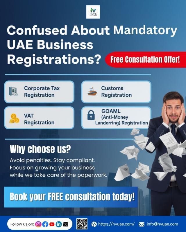 In today's complex regulatory environment, Hope Ventures delivers essential accounting, taxation, and compliance services including corporate tax management, VAT registration and filing, regulatory compliance, comprehensive accounting and bookkeeping, DMTT compliance, and customs registration services, opening of business bank account