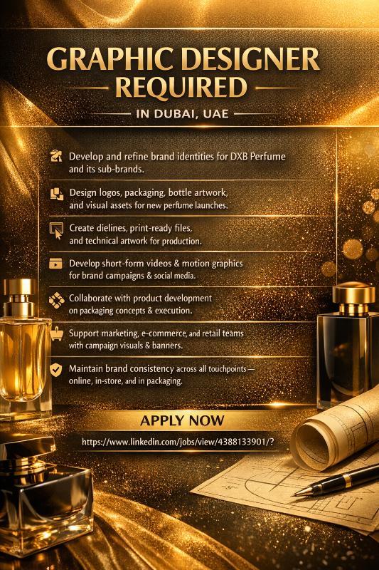 This is not a junior position — we’re looking for someone who can take creative ownership from concept to completion. You’ll be responsible for developing brand identities, designing perfume packaging and bottle artwork, and producing marketing visuals and videos that elevate DXB Perfume’s visual presence across digital and physical channels.