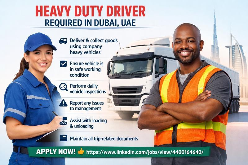 We are looking for a reliable and experienced Heavy Duty Driver to transport and deliver goods safely and efficiently. The ideal candidate will ensure vehicle safety, comply with UAE traffic regulations, and support loading/unloading operations while maintaining proper documentation