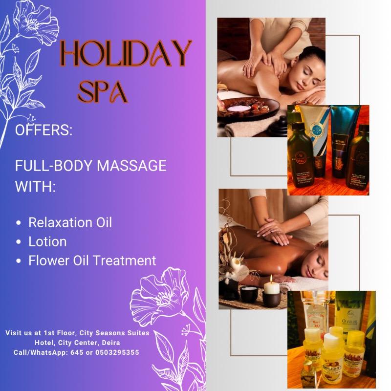 Amazing time starts with relaxation. Relax and pamper yourself. Visit us at Holiday Spa 1st Floor, City Seasons Suites Hotel, City Center Deira, Dubai. For bookings and reservations call/Whatsapp: 645 or 0503295355