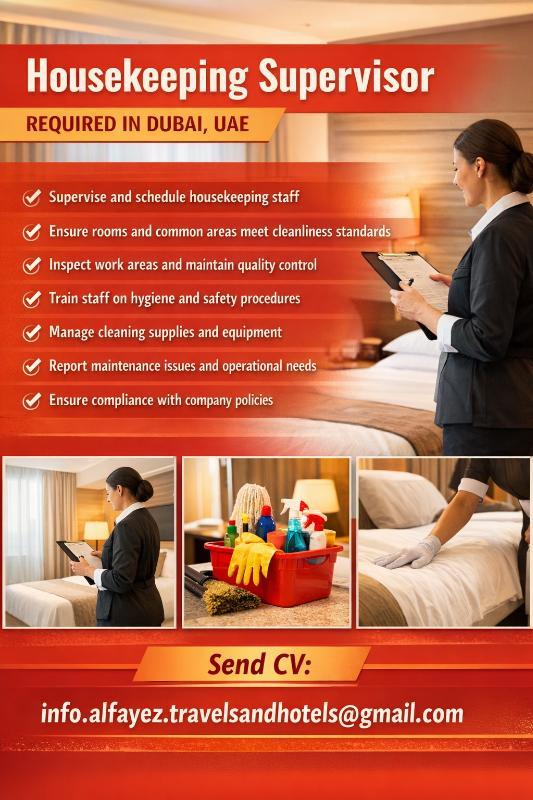 We are hiring an experienced and responsible Housekeeping Supervisor to oversee cleaning operations, manage housekeeping staff, and ensure high standards of cleanliness and hygiene across assigned premises.